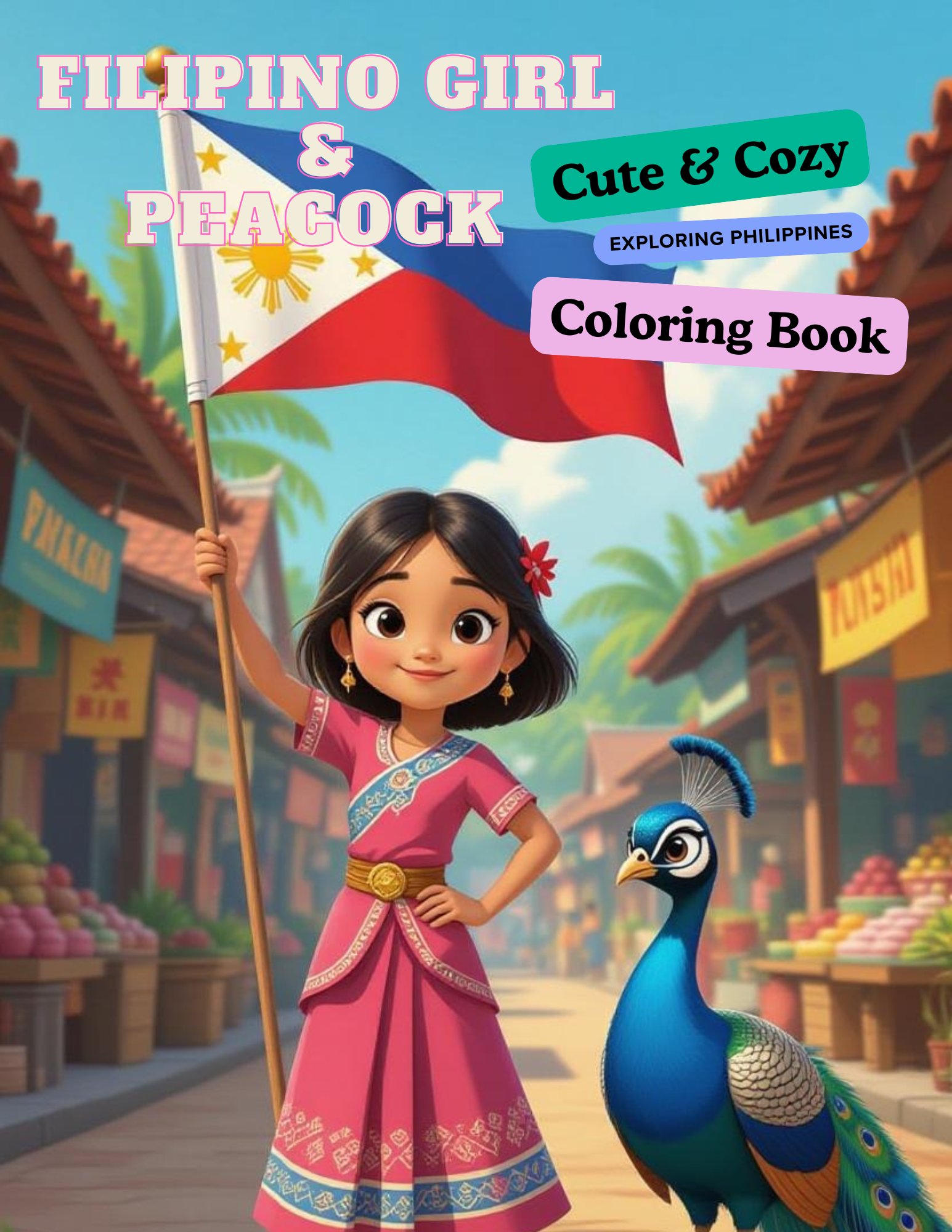 Filipino Girl and Peacock Coloring Book. With one sided cardstock coloring page for mixed media coloring.