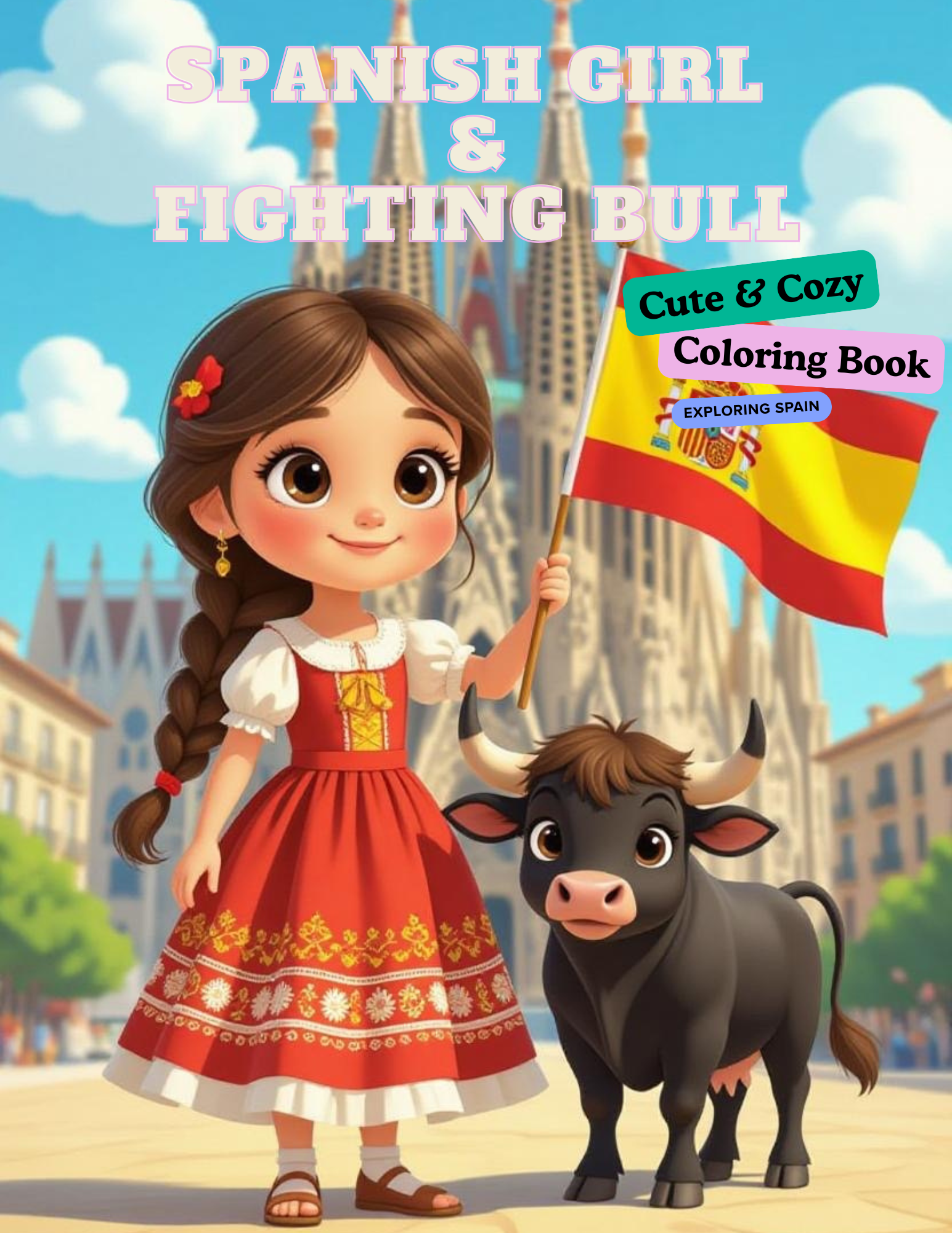 Spanish Girl and fighting Bull Coloring Book. With one sided cardstock coloring page for mixed media coloring.