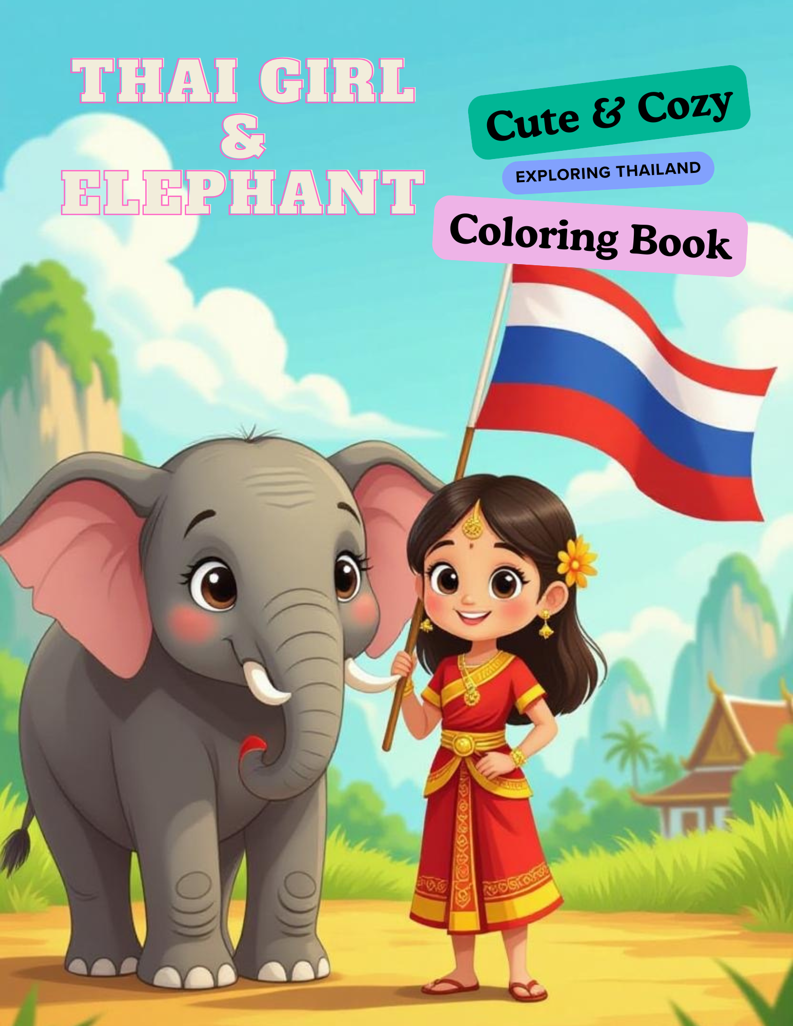 Tai Girl and Elephant Coloring Book. With one sided cardstock coloring page for mixed media coloring.